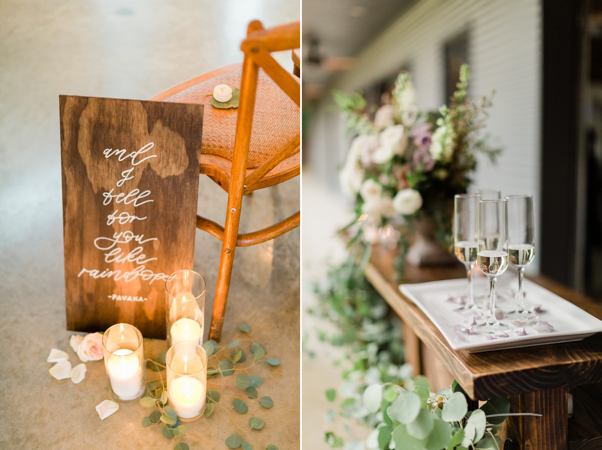 It was my first time visiting The Grove in Round Rock & I was ecstatic when I walked in to white walls & white ceilings with beautiful wooden timbers stretching across. The perfect clean backdrop for any indoor wedding or portrait session. The wood accent was pulled into the aisle markers, the welcome sign, & the ceremony chairs, & was complimented with other natural elements like linen rentals from Marquee Rentals. The light that poured in from the raised metal garage doors was to die for!